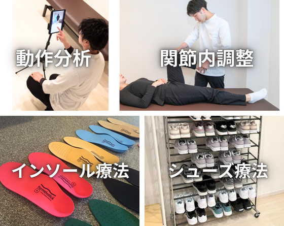各種専門検査にて病態や発症メカニズム(症状の原因)を明確にすることで、最適なアプローチを行うことができます。施術は痛みの出ないよう、お客様に確認しながら進めます。施術→再検査→施術という流れで進めることで、徹底的に改善へ導くことができます。またシューズアドバイス、ご相談によりインソールの提供も行います。